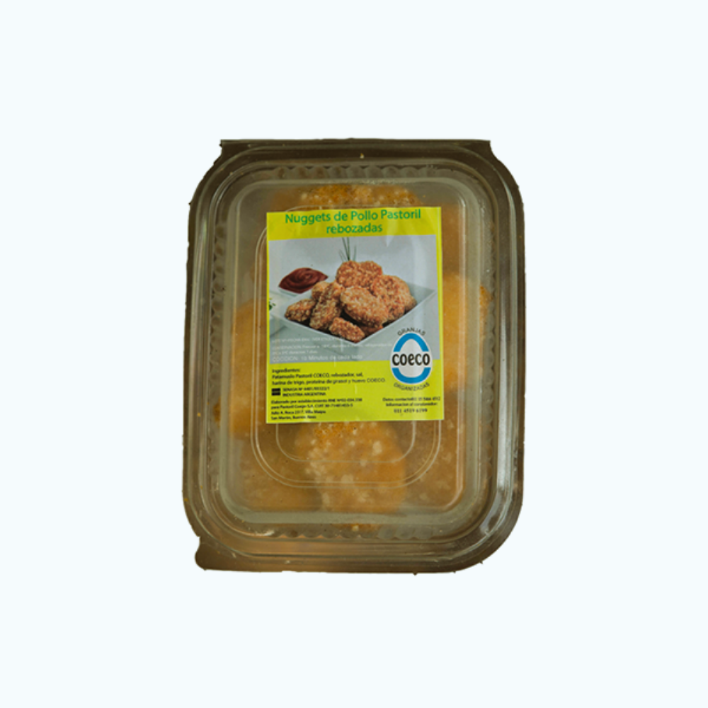 Nugget elaborado con Pata y Muslo Deshuesada o Suprema Deshuesada y rebozador de galleta molida.PRODUCTO CONGELADO